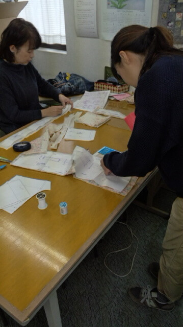 今日のソーイング教室はお子様の初節句に着るはかまと甚平さん 初心者さんのお母さんが型紙を取っている途中です なんと微笑まし事ですねぇ