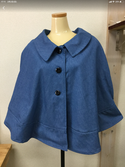 デニムのマントを5着縫いました。車椅子生活されている方に着て頂ければ嬉しいです。今までは自分の服をリフォームしていただけで、我流で雑な方法で、人様に差し上げるのは恥ずかしいですが、練習させて頂きました。これからも車椅子生活の方々に喜んで頂けるのでしたら続けたいと思います。サイズは4枚はMサイズ。1枚はやや首回りが小さ目です。先着5名様に無料で差し上げます。ニコニコミシン観音寺店まで取りに来て頂ける方はご連絡下さい。車椅子生活の方のみとさせて頂きます。ご来店はご家族の方でも構いません。実物のマントを見てお気に入らなければ、お断り下さい。